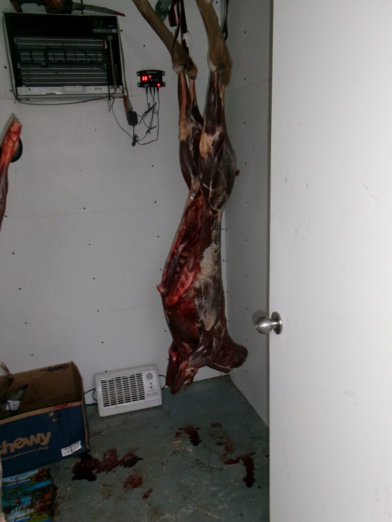 A fellow member of my rod & gun club let me use his walk-in cooler this year to hang deer in. It’s basically an insulated room with a regular AC unit installed. The AC unit is tricked out to cool to 36 degrees or so. I have to say that hanging deer for 7 to 14 days does result in better tasting meat and seems to be worth it. All beef–as far as I know–is aged. To fairly judge venison, perhaps it should be adequately aged too.