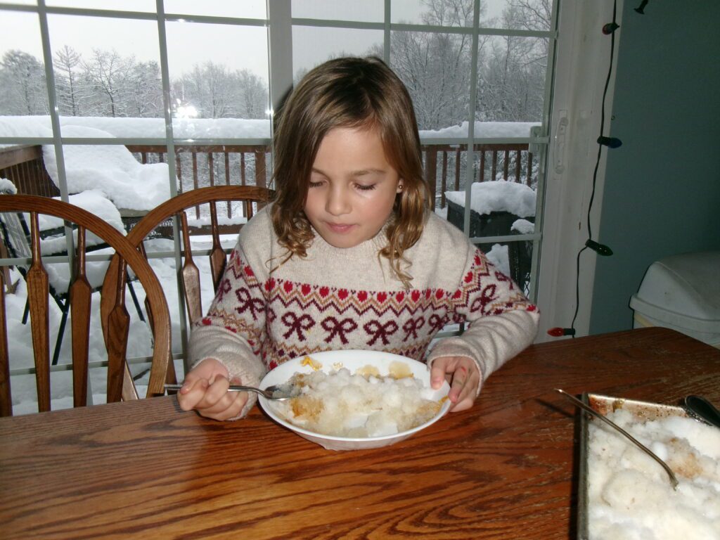 My 2nd oldest daughter–Maple–finally got her wish when it snowed recently. She’s been asking for “Maple on Snow” or “Jackwax” as some call it. This is when maple syrup is heated up to about 235 degrees and poured over fresh snow to make a taffy-like candy. Good stuff & worth doing.