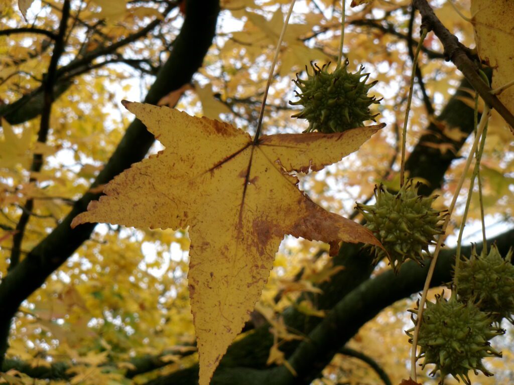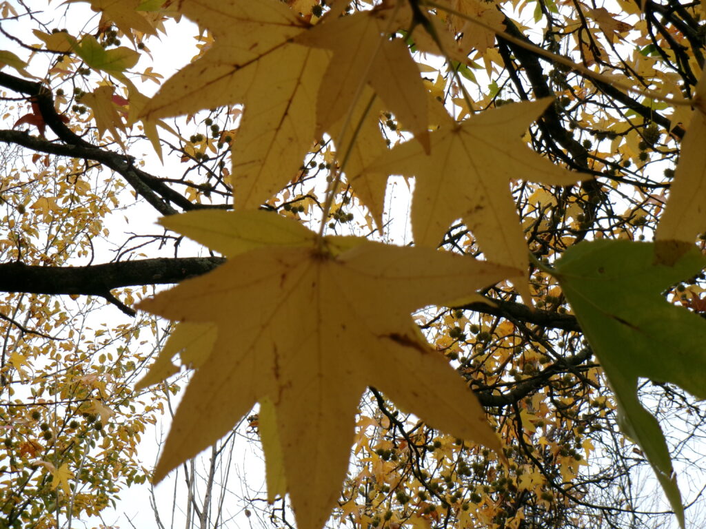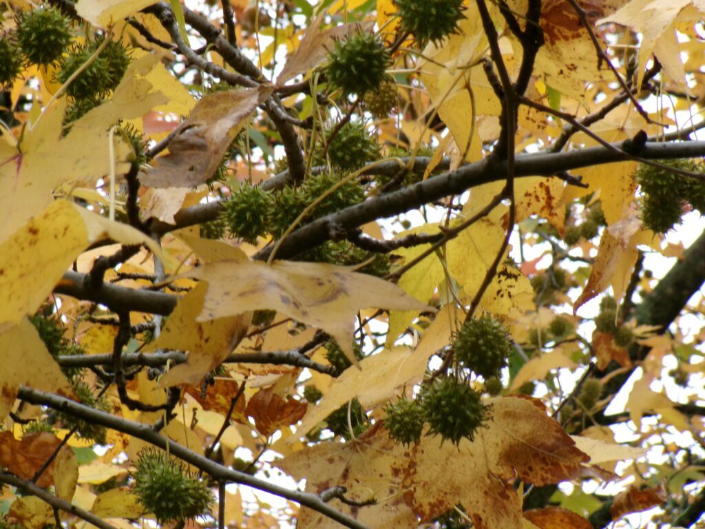 Had to go to Stamford, CT recently and came across this tree growing on its own in some woods between a housing complex and doctor’s offices. Its yellow foliage, star-shaped leaves, with spherical spiky fruit heads caught my attention. It’s sweetgum or Liquidambar styraciflua. This tree is normally found in the southern parts of New York State. Apparently, it’s cold hardy to zone 5 and could tolerate many portions of the Catskills. Its bark resembles something like a Norway maple or ash tree’s bark, and it grows similarly in height to each of those as well. In any case, you never know what you’re going to find in those random woodlots between developments.